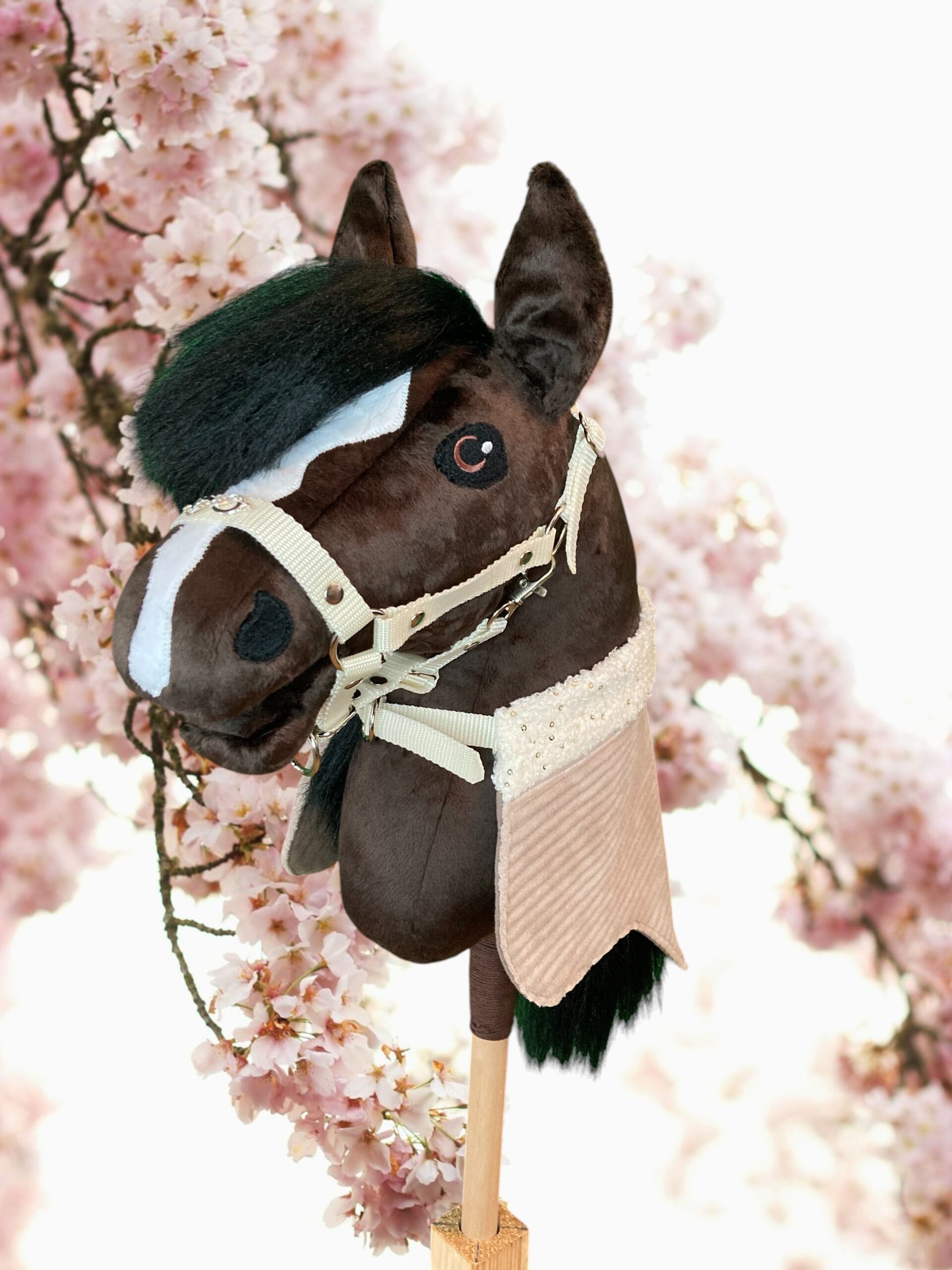 Laat je hobby horse stralen in stijl met Sandy Pearl — een zacht, elegant dekentje in natuurlijke tinten. De bovenrand is afgewerkt met een mooie strook kunstbont versierd met kleine parelglanzende pailletten, terwijl de onderzijde gemaakt is van luxe zandkleurig ribcord. De binnenkant is gevoerd met bijpassend katoen.