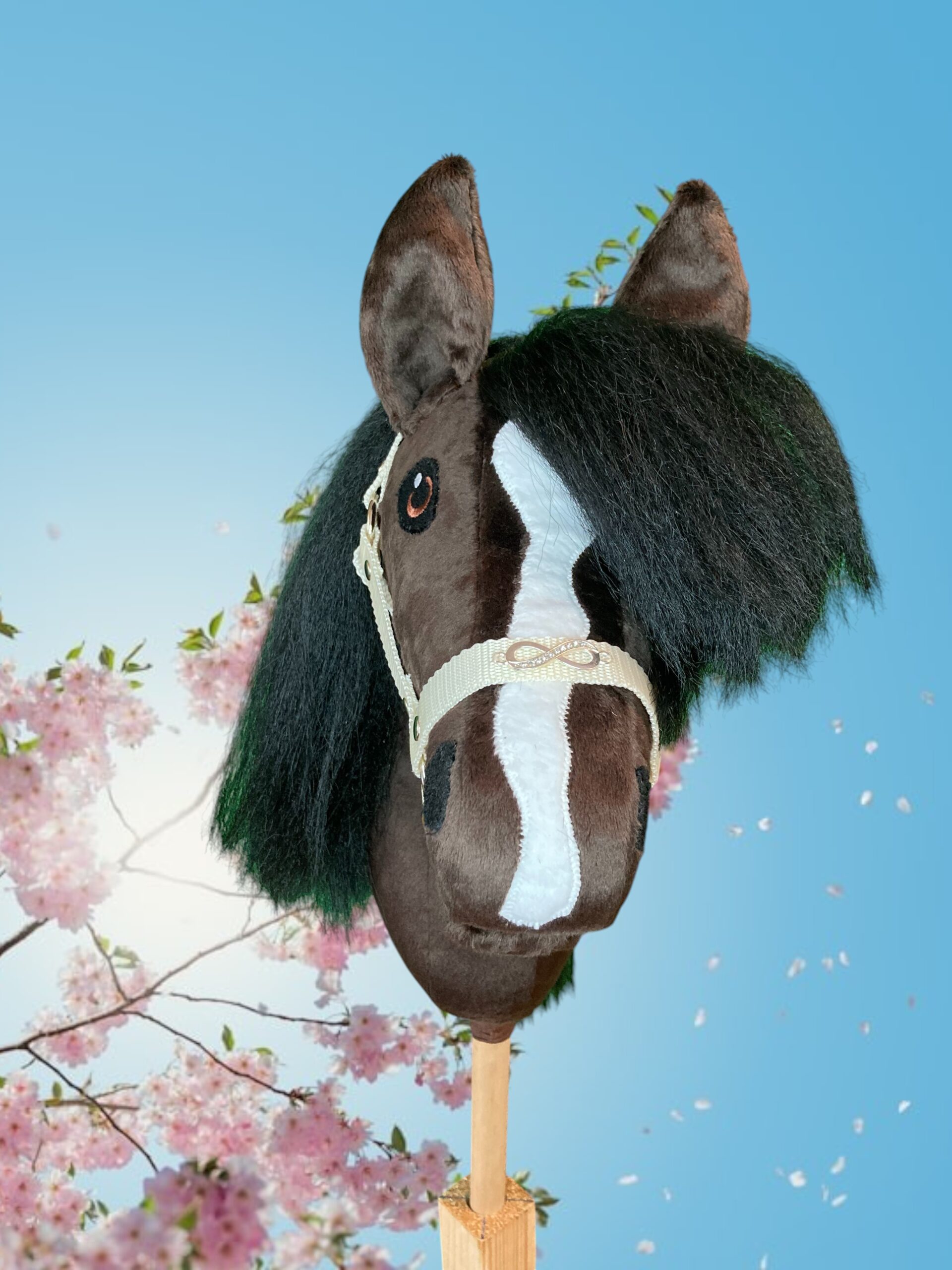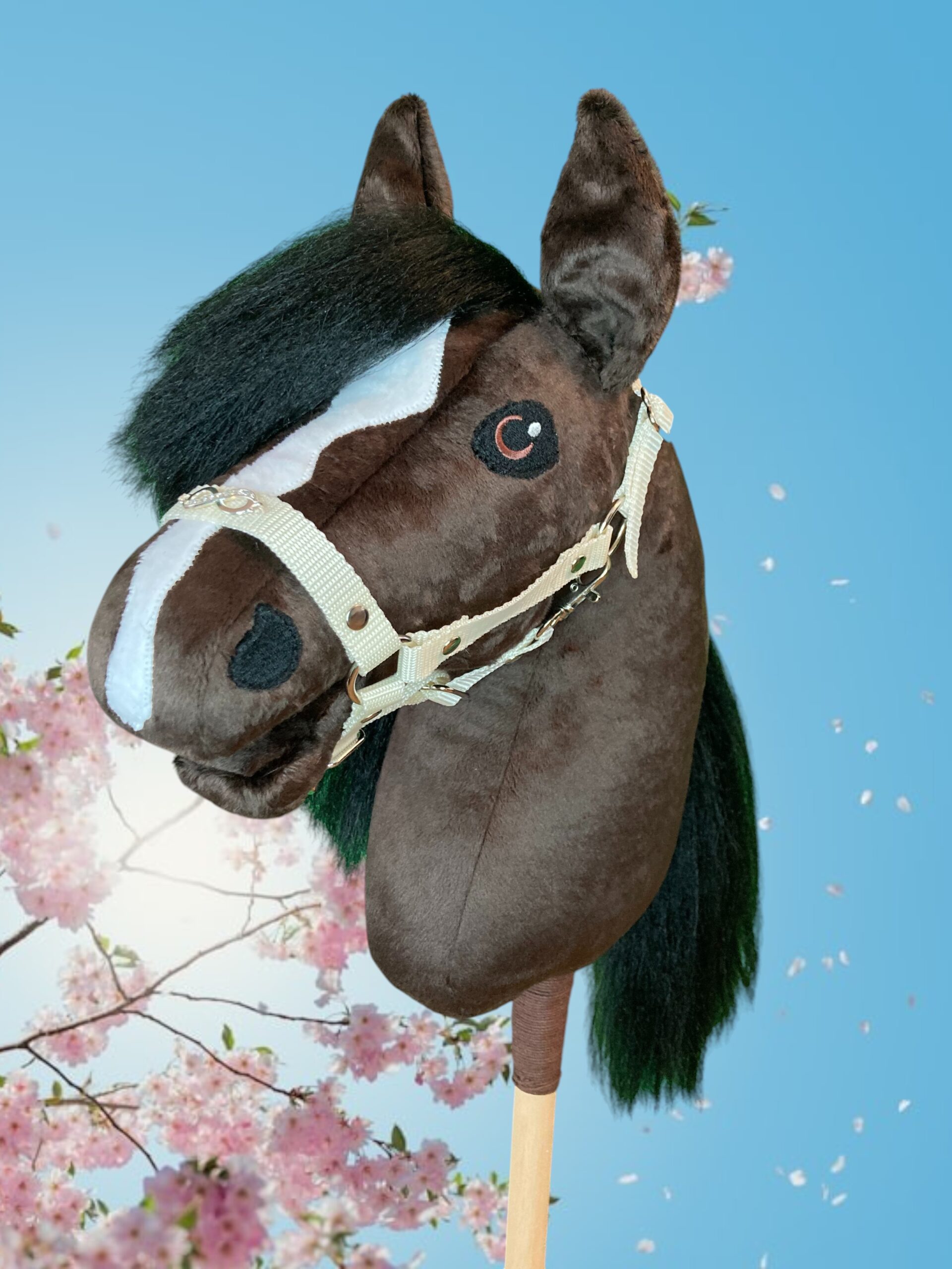 Geef jouw hobby horse een elegante uitstraling met dit handgemaakte halster in een warme vanillekleur. Het halster is vervaardigd van sterk maar soepel band en voorzien van een decoratieve Infinity-connector op de neusband. Aan de onderzijde is een metalen ring bevestigd, perfect om een halstertouw aan te klikken.