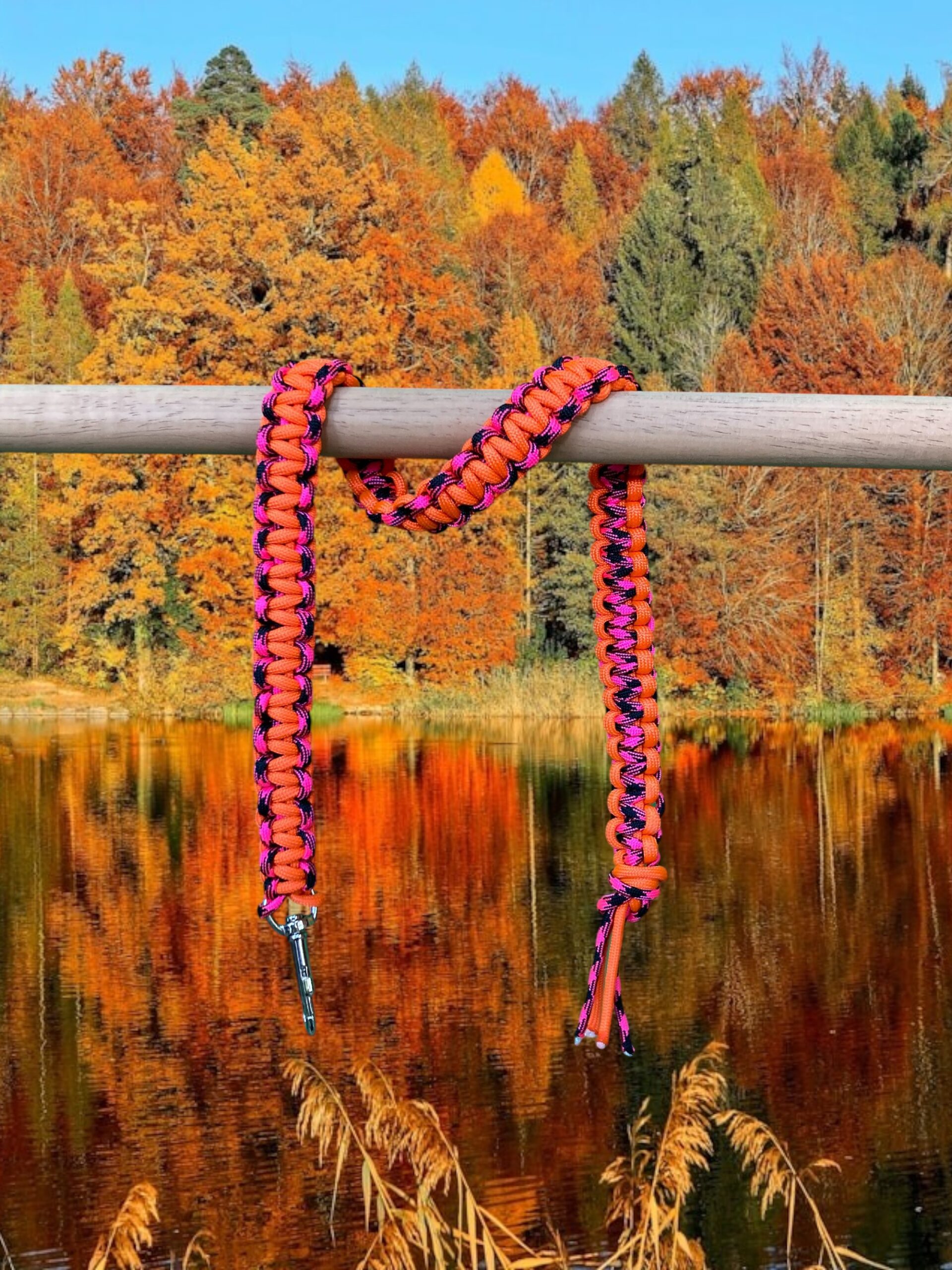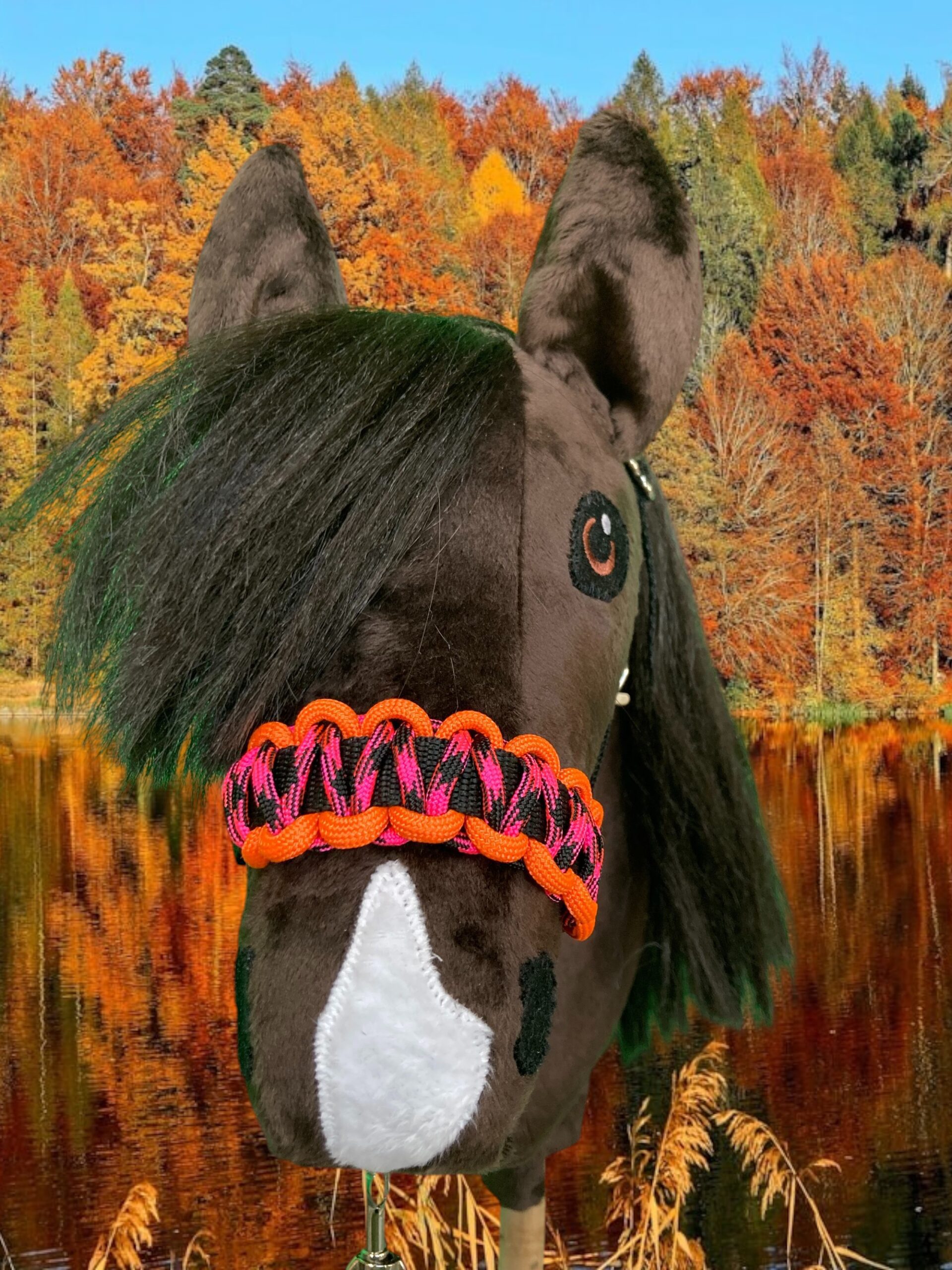 Laat je hobby horse knallen met deze prachtige set! Het stevige halster is versierd met handgeknoopt paracord in mooie kleuren. Het bijpassende korte halstertouw met musketon maakt de set helemaal compleet. De lengte van het halstertouw is, inclusief musketon ca. 60 cm. Een echte eyecatcher voor wie durft op te vallen!