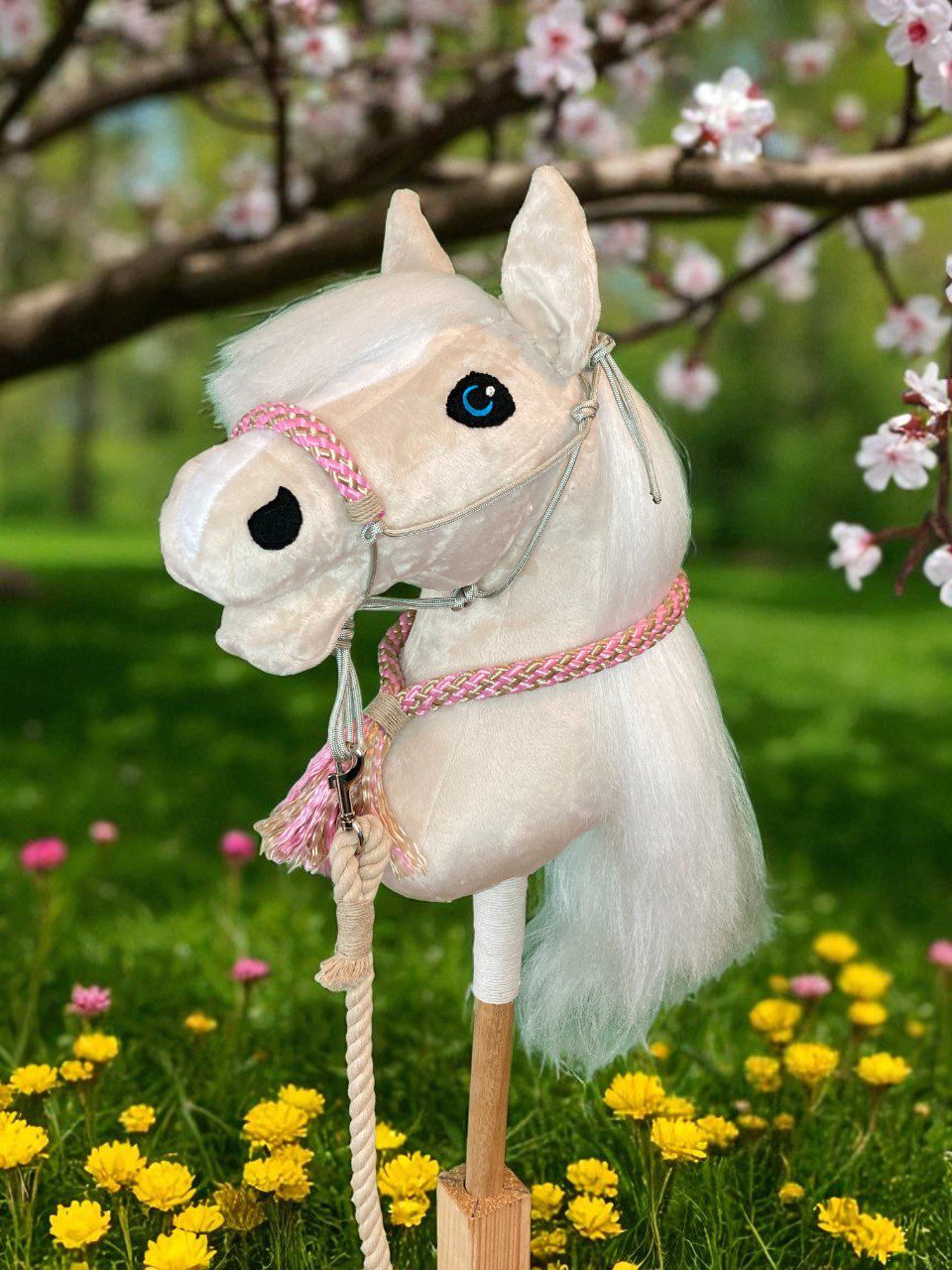 Laat jouw hobby horse stralen in de zomerzon met dit vrolijke en handgemaakte touwsetje “Pink Blossom”. De frisse zomerse kleurencombinatie van roze paracord, gevlochten neckrope in zachte pasteltinten en een naturel halstertouw maakt dit setje een echte eyecatcher.